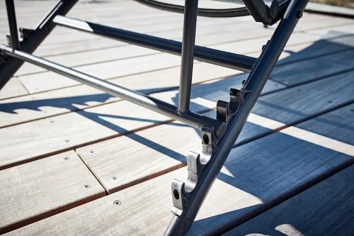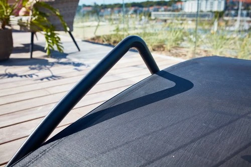 Cadre, accoudoirs : acier. Dossier, assise : polypropylène, textilène (polyester/PVC). Réglable 5 positions. l57 x L191 x H84 cm
