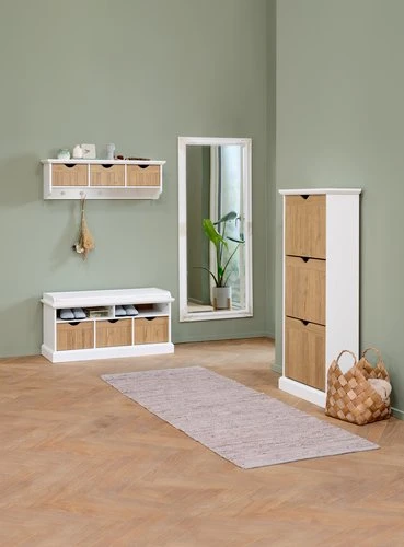 En MDF, bouleau massif, panneau de particules placage décoratif papier. Revêtement : coton. Garnissage : mousse polyuréthane (12 kg/m³). l102 x H50 x P39 cm