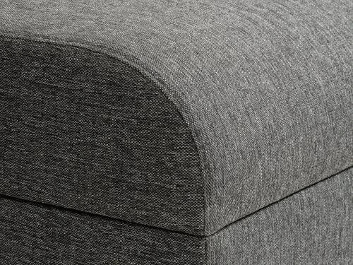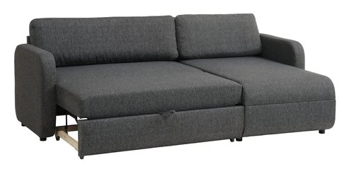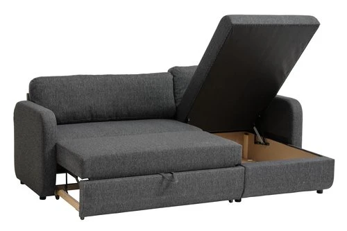 En panneau de particules, HDF6, pin massif, feutre. Garnissage : mousse polyuréthane (30 kg/m³). Assise : ressorts bonell. Revêtement : polyester. Pieds : plastique. Avec espace de rangement. Réversible. Couchage : 131×200 cm. 3 places. l222 x H85 x P88/142 cm