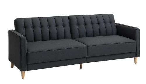 En contreplaqué, acier et bois de caoutchouc massif. Garnissage : mousse polyester (30 kg/m³). Revêtement : polyester. Couchage : 112×200 cm. 2 personnes. l222 x H86 x P86 cm