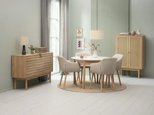 Structure : contreplaqué, acier. Garnissage : mousse polyuréthane (22-25 kg/m³). Revêtement : polyester. Pieds : bois de caoutchouc massif. l59 x H82 x P59 cm