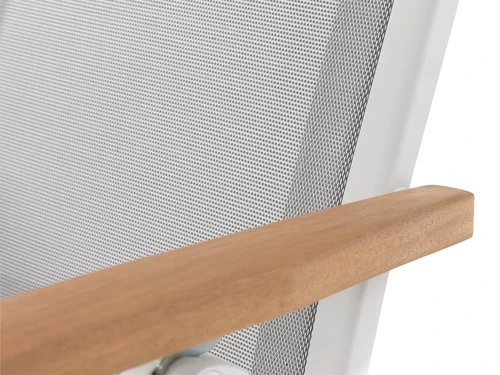 Cadre : aluminium. Dossier et assise : plastique et textilène (polyester/PVC). Accoudoir : eucalyptus massif FSC®. 5 positions. Pliable. l66 x H107 x P71 cm