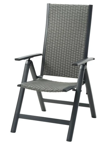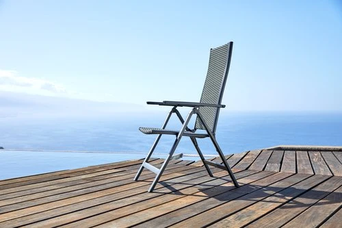En aluminium et polyrotin (polyéthylène). Inclinable 6 positions. Pliable. l58 x H110 x P70 cm