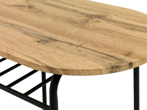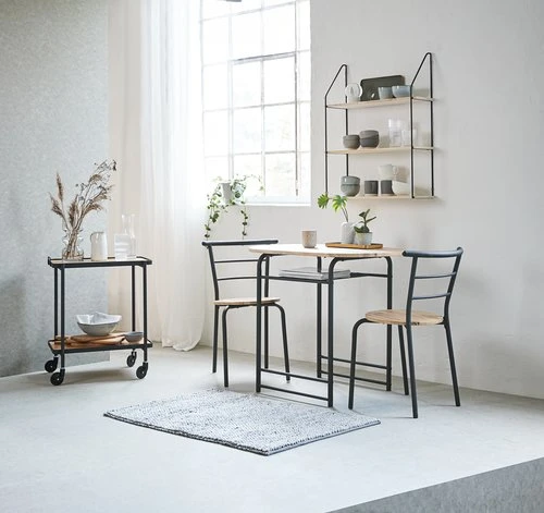 Plateau de table, assise : MDF revêtement mélamine. Structure, piètement, dossier : acier. Table + 2 chaises. l55/46 x L92/50 x H75/77 cm