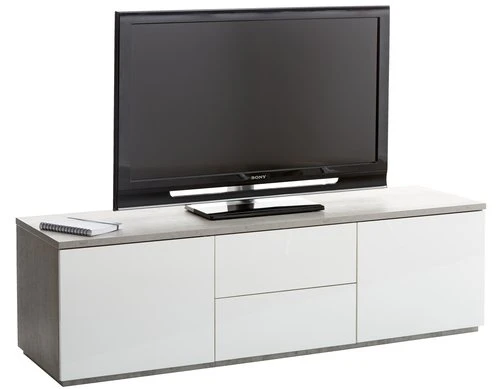 Face avant, partie supérieure et inférieure, côtés : panneau de particules mélaminé. Surface, étagère : mélaminé. Non traité. 2 portes push-open, 2 portes rabattables. l150 x H45 x P45 cm