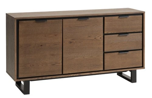 Cadre : panneau de particules mélaminé, chêne et pin massifs. Partie supérieure : panneau de particules, placage chêne, chêne massif. Côtés, portes, faces tiroirs : panneau de particules, placage chêne. Étagère : panneau de particules mélaminé. Pieds : MDF, pin massif. Incl. 1 étagère. 2 portes, 3 tiroirs. l150 x H80 x P40 cm