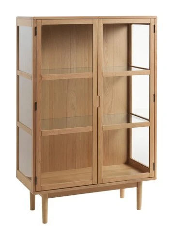 Face avant, côtés : chêne massif, verre trempé. Partie supérieure et inférieure : placage chêne, panneau de particules. Étagère : verre trempé. Pieds : chêne massif. Vernis transparent. l80 x H126 x P35 cm