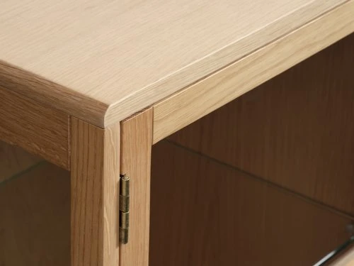 Face avant, côtés : chêne massif, verre trempé. Partie supérieure : panneau de particules, placage chêne. Pieds : chêne massif. 2 étagères en verre. 3 portes. l120 x H80 x P35 cm