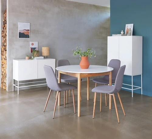 Partie supérieure : MDF mélaminé, acier. Cadre, pieds : bois de caoutchouc massif. Vernis. Incl. 2 rallonges (dimensions avec rallonges : l110 x L200 x H75 cm). Ø110 x H75 cm