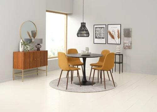 Plateau : MDF, placage frêne. Structure : béton, acier, polypropylène. Pieds : acier. Vernis. Ø100 x H75 cm