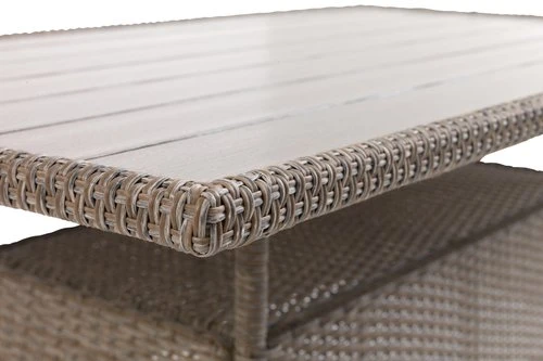 | Matériaux | Cadre: Acier, Dessus de table: Imitation bois (polystyrène)Cette imitation bois est faite à partir d’un matériau synthétique sans entretien dont la structure créé un effet de bois naturel. Elle est fabriquée à partir de plastique, tel que le polystyrène, qui constitue un matériau durable et résistant aux intempéries. Cette imitation bois est protégée contre les UV, ce qui garantit une surface dont la couleur ne change pas., Polyrotin (polyéthylène)Le polyrotin est un type d’osier synthétique et léger. Il est résistant, protégé contre les UV et résistant aux intempéries., Pieds: Polyrotin (polyéthylène)Le polyrotin est un type d’osier synthétique et léger. Il est résistant, protégé contre les UV et résistant aux intempéries., Acier |